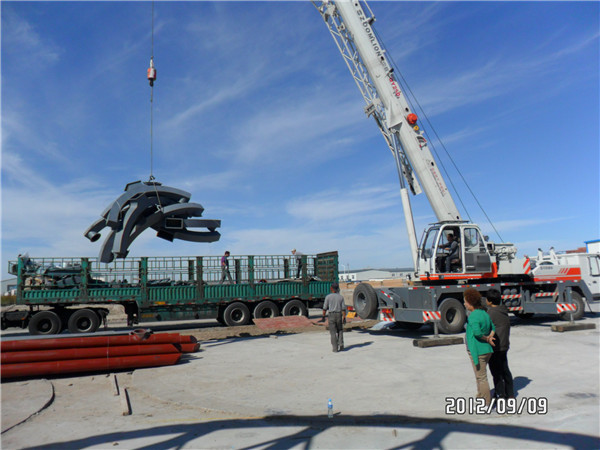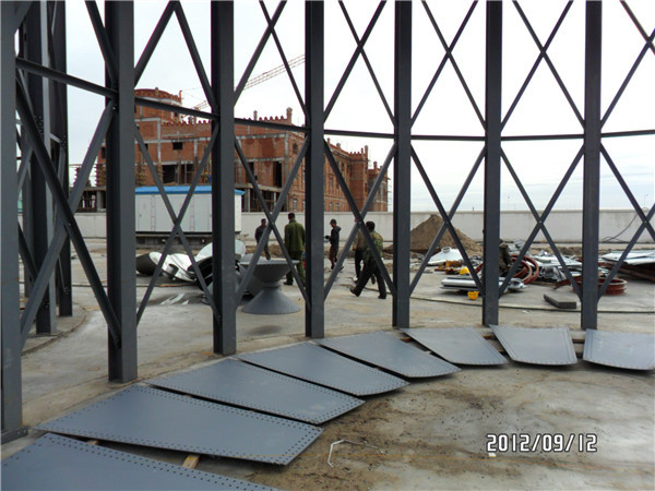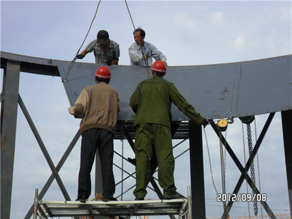 安装时,根据仓径的大小,采用多个吊装架,吊装架上固定一个手动葫芦,使用特制的吊板用螺栓固定在仓壁墙板上,缓缓提升仓体。采取自上而下的安装方式,即先安装顶盖、上层墙板,然后在装中层墙板,再装下层墙板,后将整个仓固定在基础上。筒仓的构件全部采用高强度螺栓连接,安装方便、迅速、可靠。