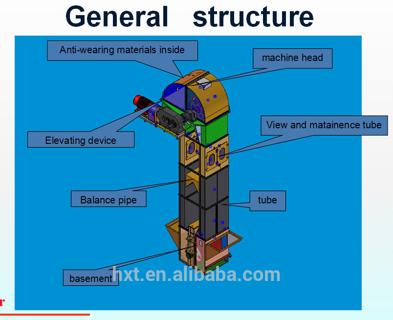 本机适用于粮食、肥料、饲料等行业颗粒状或粉状物料的垂直输送。具有提升稳定、占地面积小、提升度高、密封性能好等优点。
