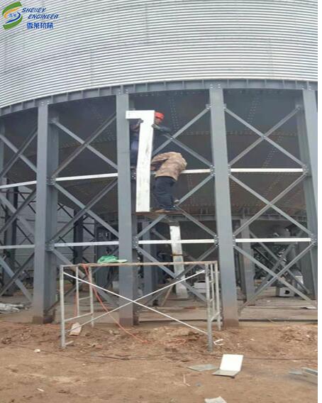 此项目为山东烟台地区饲料厂金年会金字招牌信誉至上首页:钢板仓改造加仓工程,客户原有2台钢板圆筒仓,用了很多年,现由于生产规模扩大需加仓3台1500吨玉米仓,在历经不到2个月左右的安装施工,近期终于迎来了收尾工作。